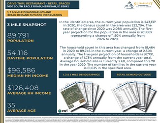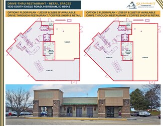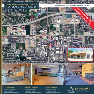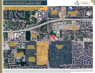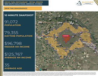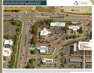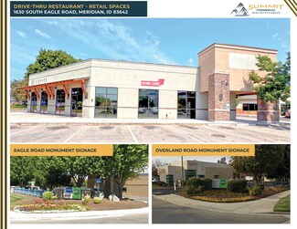 Former Lucky Perk coffee & retail space available for lease on the signalized hard corner of Eagle & Overland Roads. Amenities include five entries, large open sales floors, large storefront glass, hood, grease-trap, 2 restrooms, on-site parking, building & monument signage areas, patio dining areas, existing drive through, and access from both Eagle & Overland Roads. Potential uses include drive through restaurant, coffee shop, retail sales, office, & other service-related uses. Surrounding retailers, restaurants and traffic generators include the Silverstone & El Dorado business parks, Courtyard by Marriott, Topgolf, Hyatt Place, WoodSpring Suites, TownePlace Suites, Taco Bell, Jimmy John’s, Jack in the Box, Chicago Connection. Located at Interstate 84 exit 46, between Meridian Road & the Flying Y / I184 Connector leading to downtown Boise. Strong demographics - 54,116 employees within a 3 mile radius, & 79,355 employees within a 10 minute drive-time.