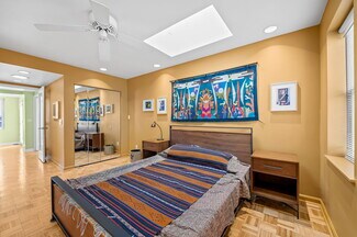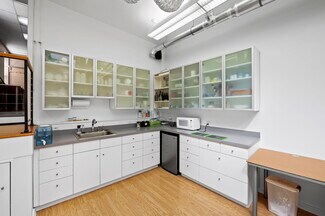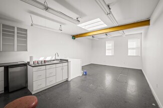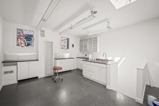 As you move through the remainder of the ground floor, you are greeted by a well designed 3-room maker space. The first room consists of hardwood floors, cabinetry, countertops, and a sink. On the opposite side, there is plenty of room for a table, chairs, or additional workstations, plus two large windows creating a pleasant environment. The 2nd room provides a different atmosphere and allows for larger projects with its tall ceilings, large skylights, and bright lighting installed throughout. The luxury vinyl plank flooring add to the refinement. Another bank of cabinets, including fogged glass doors, plus a sink, refrigerator, and microwave make for a complete workroom. Next, through a sizable doorway, is a dream workshop. This area is ideal for dusty projects, with its concrete floors, wall rack for tools, cabinets, utility sink, and plenty of floor space for you to make it your own. Conveniently located oversized loading doors with easy access to the alley in back make it a snap to move things in and out. An additional room sits just above the workshop which makes for an ideal studio with a hoist, 2 access hatches for long and narrow items such as frames or stretchers, a skylight and you guessed it, more cabinets, drawers and a utility sink. There is also a plumbing rough-in which would allow for an additional bathroom to be added. The options are near endless, and provide the perfect launchpad for the creative professional. However, it doesn’t stop there!