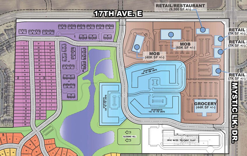 HJ Development is marketing Eagle Crest Commons, a 145-acre mixed-use development. Located in the SW corner of 117th Ave. E & Mystic Lake Dr., the project will consist of commercial, residential, and public gathering spaces. Approximately 23-acres are slated for commercial development. Envisioned uses include grocery, multi-tenant retail, banks/credit unions, freestanding restaurants, and medical office buildings. Construction start is planned for Q3 2025. For more information please contact us directly.