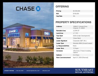Chase Bank ground lease for new construction of a 2,290 SF freestanding building on 1.1 AC with scheduled opening/commencement date of April 27, 2026