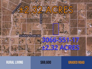 APN 3066-551-17 is a rectangular parcel on the north side of Sunny Slope Road, east of Johnson Road. Adjacent to the site is an existing home with power established, buyer to verify all utilities.  Graded road frontage.Multiple Rural Residential Lots For Sale in the beautiful rural area of Phelan, San Bernardino County, CA.  Enjoy spacious parcels with plenty of room for private, quiet living in an established rural neighborhood. Views of distant mountains to the south make this a desirable place to call home.  Quick access to grocery, conveniences and schools.