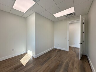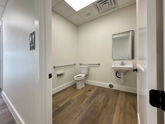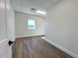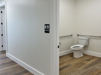 The interior combines 1,000 SF of finished office space with a 3,000 SF warehouse. Office buildout includes a reception entrance, two private windowed offices, kitchen/break room, and ADA restroom. The warehouse features three grade level drive in doors with 14’ x 14’ clear-height, a 16’ eave pitch ceiling, and its own restroom.