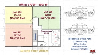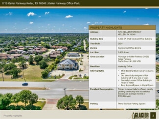 Beautifully-Designed Medical/Professional Office Building • Located on the High Traffic Keller Parkway • New Construction 1.5 Story Office Building • Easily accessible to major restaurants:, shopping centers and hotels
