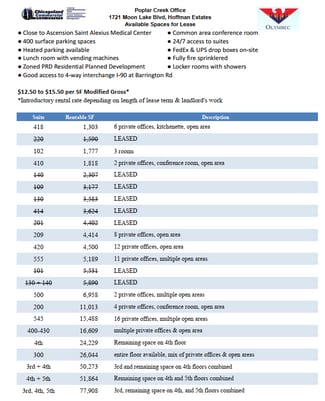 1721 Moon Lake Boulevard is a five-story structure with a dramatic three-story atrium. It currently has spaces between 250 - 75,000 square feet of contiguous office or medical space for lease. There are model suites available for immediate occupancy. The landlord will customize office buildout to meet tenant needs, and there is an extensive property renovation underway! Tenants have free access to fitness center with men's and women's locker rooms, as well as a common building conference and lunchroom. Onsite Property Management & Building Engineer On Site !