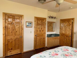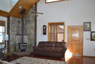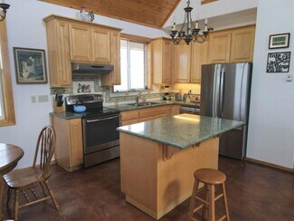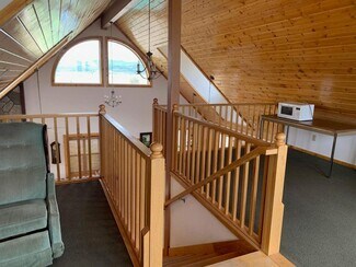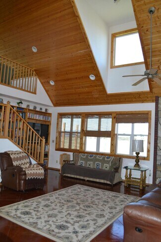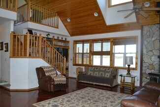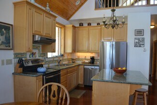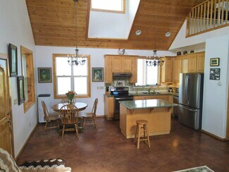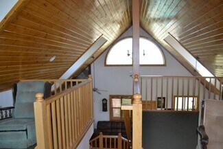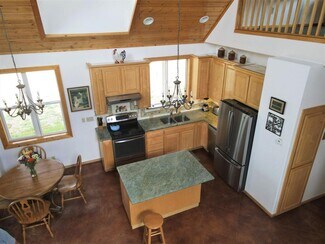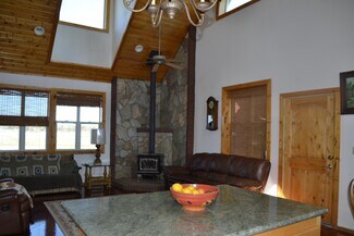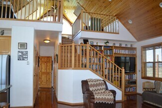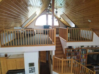 • Interior open space with living, dining and kitchen under cathedral knotty pine ceilings. Granite counters set off the corner kitchen, stainless appliances and intricate tile imported from England. Floor to ceiling river rock hearth with wood stove. Built in bookcase leads to the upper loft overlooking the living area. Solid wood pine doors with antique style handles.