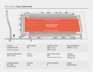 OTTAWA LOGISTICS CENTER is a proposed 1,000,903 SF freestanding industrial building on approximately 52 acres. The building will feature approximately 10,000 sf allocated to office use, cross-dock configuration, 42’ clear height, 236 dock high loading doors, 4 drive in doors, 130’ truck court depths, 306 trailer stalls and 328 auto parking stalls. The subject property is strategically positioned within the 233-acre Foxborough Industrial Park with exceptional connectivity to Interstate 15, Interstate 40, and Highway 395. The property is located within an extensive network of air, ground, and rail transportation which makes it an ideal location for built-to-suit developments and optimal for warehousing and logistics. Corporate neighbors include Americold Logistics, The Nutro Company, Church & Dwight, Amazon & Goodyear.