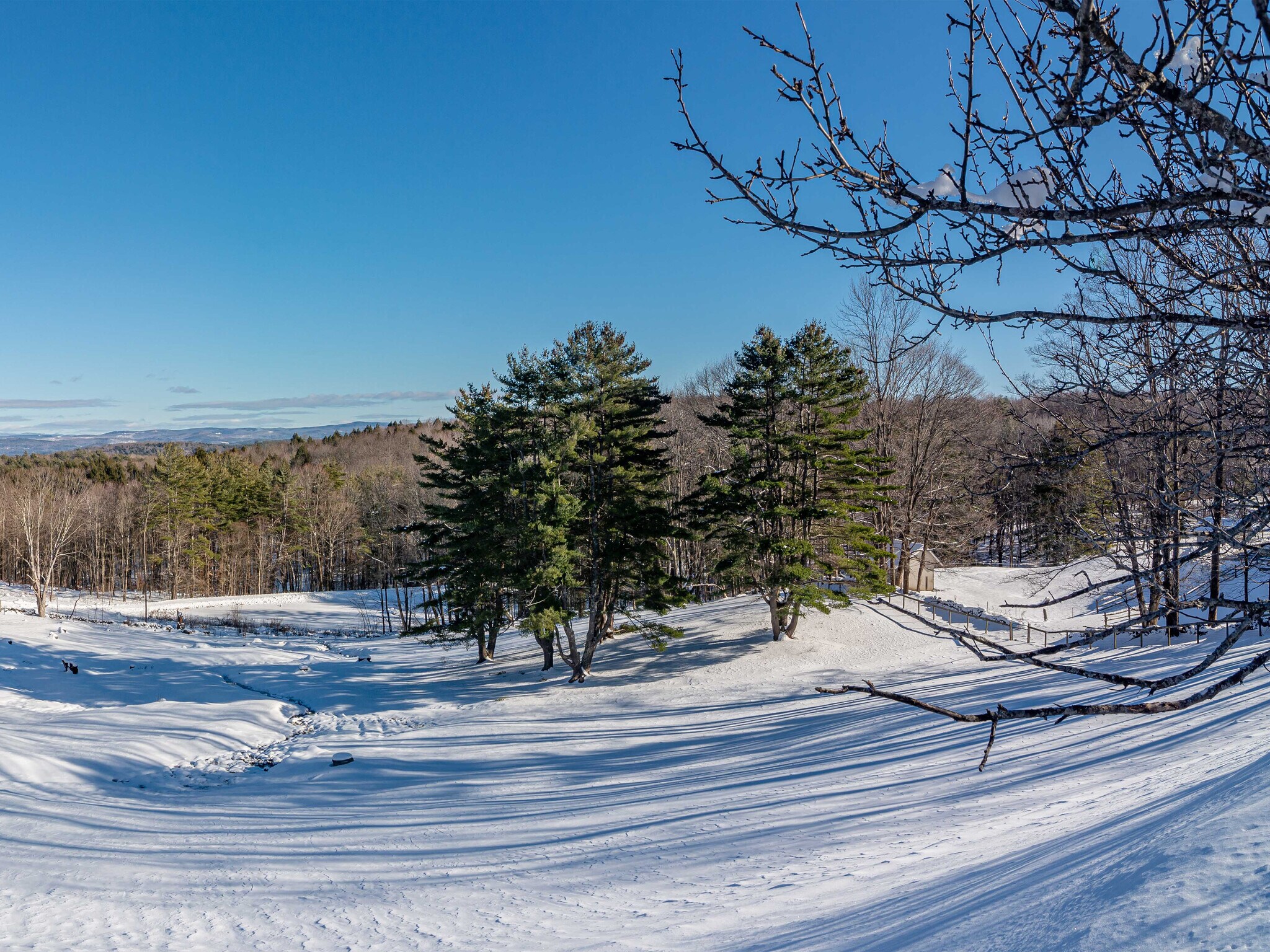 A spectacular landscape of mountain views, meadows bounded by stone walls and ancient maples, ponds, miles of trails, apple trees, full equestrian amenities, and an abundance of choice for places to build a spectacular home and compound. Hamilton Farm is on a quiet country road 15 minutes outside the village of Woodstock. The land parcel of 284 acres is on some of the prettiest land in Vermont with big views that face East toward the White Mountains. A vast network of carriage trails offers miles of opportunity for extensive walking, cross-country skiing or mountain biking. The three ponds, one stocked with rainbow trout, attract blue heron and other wildfowl and are a delight for humans who like to swim and play in the cool, clear water. For many years it has been the home of the Hamilton Rare Breeds Foundation, whose goal was to preserve rare breeds including the Poitou donkey, Dale ponies and Chocktaw mustangs. It was also a state-of-the-art training center for combined driving with its “hazards” and two large rings. Pat Hastings, the farm manager, trained here to qualify for the FEI Driving World Championships. The equestrian facilities include a ten stall indoor arena complex, a foaling barn and a 4 bedroom apartment and office, an outdoor sand dressage arena, a larger driving arena and numerous fenced paddocks with run-in sheds. 15 miles from Lebanon Airport; 15 miles from Suicide Six; 19 miles from Dartmouth College and 27 miles from Killington.