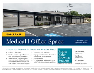 Medical or Office Space • Suites A & B Available: Approximately 2,654 square feet • Located near the high traffic corner of W 18th Ave, and Chambers St. • Two shared ADA restrooms • Signage available on new illuminated pylon sign at W 18th entrance • On-site parking • $1.15/SF/Month NNN (NNN’s equal to $0.74/SF/Month, including utilities)