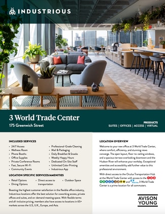 Industrious is pleased to present premier coworking, offices, and meeting spaces at 3 World Trade Center. Just blocks from City Hall and the New York Stock Exchange, this flexible workplace stretches across two stories of the new, 80-story 3 World Trade Center. From the open terrace on the building’s 17th floor, you can take sweeping views of downtown Manhattan and the Hudson River during your workday. Boasting the highest customer satisfaction in the flexible office industry, Industrious locations offer the best solution for coworking access, private offices and suites, and on-demand meeting space. With flexible terms and all-inclusive pricing, members also have access to locations in 65+ markets across the U.S, U.K., Europe, and Asia.