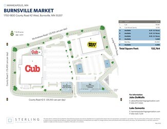 Burnsville Market is a grocery-anchored retail site located approximately 15 miles south of downtown Minneapolis in Burnsville, MN. The property is anchored by Cub, Cub Wine & Spirits and Best Buy. The site has excellent visibility from County Road 42 W in the heart of the retail corridor within the Burnsville Center regional trade area. Over 73,000 people live within a 3-mile radius where the average household income is over 123,000.