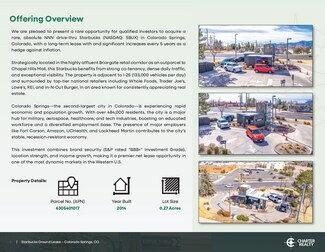 We are pleased to present a rare opportunity for qualified investors to acquire a rare, absolute NNN drive-thru Starbucks (NASDAQ: SBUX) in Colorado Springs, Colorado, with a long-term lease with and significant increases every 5 years as a hedge against inflation.