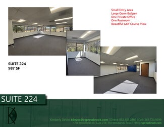 1776 Woodstead Ct | The Woodlands TX Spaces Available: • Suite 205 – 2,312 SF • Suite 220 – 1,521 SF • Suite 224 – 987 SF FULL SERVICE LEASE 24-Hour Access Private restrooms and Tenant controlled AC in each suite Reserved parking available Gorgeous golf course views On-site management Seconds away from I-45 Near The Waterway, Market Street, Hughes Landing and Pavilion Tenants are responsible for telephones/Internet Located directly off Six Pines and Woodlands Parkway. Easy access to I-45, The Hardy Toll Road, and Grand Parkway (99).