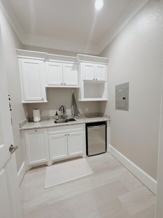 The suites benefit from a shared entryway lobby and common areas, including a practical kitchenette and bathroom facilities,