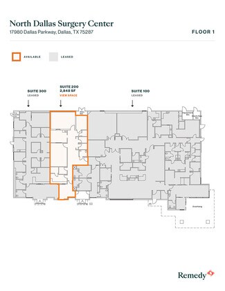 This single-story outpatient surgery center is anchored by Texas Health Resources ASC, which features two operating rooms / ORs and nine pre/post-op beds, already establishing this as a healthcare destination. North Dallas Surgery Center offers plenty of surface parking and a covered patient drop-off for seamless access and flow. The landlord is offering these suites on highly flexible terms and significant tenant improvement allowance is available to build-out lab space, specialty exam rooms, and more to accommodate specified needs.