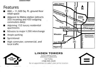 Linden Towers Commercial Spaces are adjoined to 153 luxury residential apartments. Located on the first floor of the Linden Towers building, these 890-11,500 square feet ground floor retail spaces feature ample parking, sprinkler systems, and are adjacent to the local Metra/Pace station (attracts 350 incoming and 450 outgoing commuters daily). The I-190 interchange is just minutes away and adjacent roads receive high commuter, commercial, and local traffic daily. Linden Towers stands in the heart of Bensenville, a 100 year old community which has successfully preserved its country flavor while growing economically with a blend of residential, commercial, and light-industrial neighborhoods. The historic character of the village may be seen in the Old Green Street School and "Old Bensenville," an area of lovingly cared for homes in the vicinity of Center, Addison, and Green Streets. White Pines Country Club, with its year round golf and economical yearly pass, the public library, and the Bensenville Community Center offer recreational, research, education, and civil involvement opportunities. A variety of churches, schools, and daycare centers are within walking distance of Linden Towers. Fourteen community parks provide miniature golf, swimming, water park activities, softball, football, soccer fields, ice skating rinks, basketball and tennis courts, skate parks, playground equipment, and picnic sites.