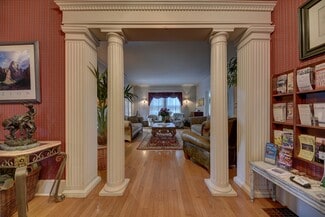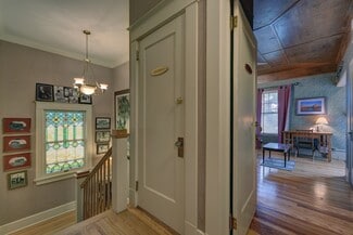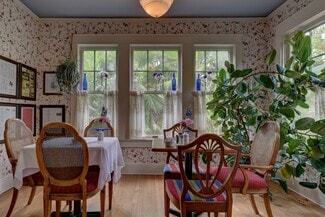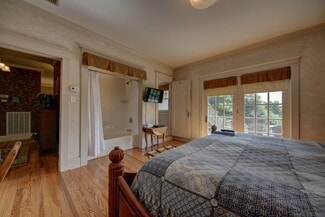 This 2-Story historic home features the original Brick Exterior and Slate Roof and is bursting with charm. The approximately 3,222 square feet includes 6 Guest Suites & en suite Bathrooms, Kitchen, Living and Dining Areas. The main floor is beautifully furnished with equipment, linens, etc. and consists of the Kitchen (3 ovens, one is convection oven, steam cleaning dishwasher, side-by-side refrigerator, gas cook top, griddle), two Dining Areas and Living Area, Shared Half Bath as well as the former Library/Dr. Hasskarl’s office which is now a Guest Suite with Full Bath. There is plenty of space for all guests with seating for 18 in the Dining & Living Rooms. Upstairs are the remaining 5 Bedroom suites each with private Bathrooms, some with tubs and balcony access overlooking the grounds. There is also a Basement used for Storage. Zoned heating and air conditioning, one upstairs and one downstairs. Most recent renovations done in 2017 by current owners.