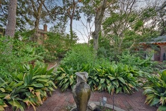 Meander the private Garden Walkways with Fountains and paver Footpaths to multiple sitting areas and Natural Gas Fire Pit lined with lush greenery.