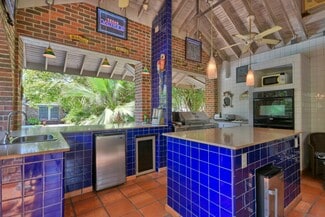 Refreshing pool surrounded by greenery and fenced for safety with lounge chairs. Adjacent to the pool is the fully equipped outdoor entertainment area! This brick building with archways, high ceilings and fans is a great shaded poolside escape for those hot Texas Days. The Pavilion offers plenty of seating, bar openings to the pool area, a Fireplace, TV and Outdoor Kitchen with grills, sink, double oven, ice maker, microwave and refrigerator.