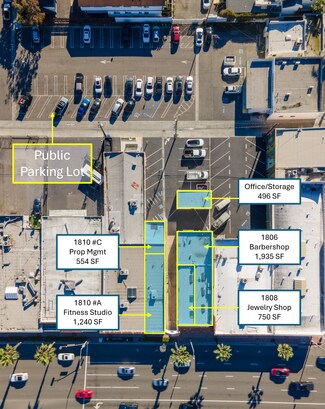 The street-facing units include 1806–Barbershop, an L-shaped space with a front retail area and a large private entertainment room that has long been home to Hawleywood’s Barbershop, founded by the creator of the men’s grooming brand, Layrite; 1808–Jewelry Shop, an efficient 14' x 50' retail unit with 10-foot ceilings; and 1810 #A/B–Fitness Studio, an approximately 18' x 50' space with 12-foot ceilings and expansive glass windows.