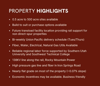* Located on Union Pacific Rail Line just 3 miles from Utah SR 56, 7 miles from Interstate 15,
