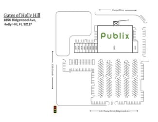 Gates of Holly Hill at 1850 Ridgewood Avenue is a well-maintained retail strip established in 2002 near Ormond Beach and the Halifax River. Spanning 58,607 square feet, this vibrant shopping center is anchored by a high-traffic Publix grocery store, which draws a steady flow of customers year-round. With available spaces ranging from 1,200 to 2,600 square feet, companies from diverse industries have an ideal space to start a business.