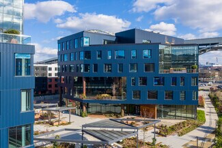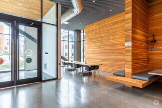 Unmatched amenities include a modern, fully-equipped fitness center, showers and lockers, a commuter lounge with bike parking for over 200 bikes, a café serving coffee and breakfast/lunch options, rotating food truck service, conference center seating up to 41 people, private outdoor terraces on every floor, a communal roof deck with river views, Children's Garden daycare on site, and secure underground parking.