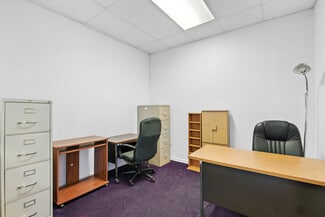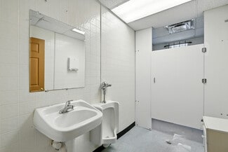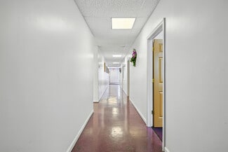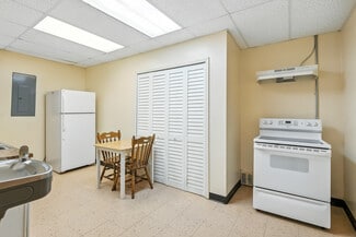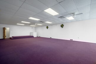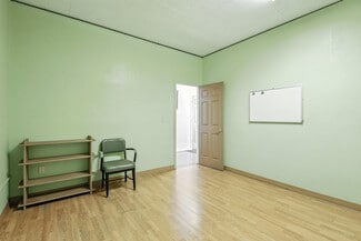 The building features a bright glass block entrance, a spacious open assembly area, four private offices or classrooms, a storage area that could easily be converted into a fifth office or classroom, and on-street parking. Additional highlights include a full kitchen and two ADA-compliant restrooms. The interior is easy to reconfigure, allowing businesses to adapt the space to their specific needs and future growth.