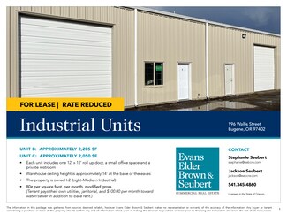 West Eugene Industrial Units B & C TWO UNITS AVAILABLE • Unit B: 2,205 square feet • Unit C: 2,050 square feet • Each unit includes one 12’ x 12’ roll up door, a small office space and a private restroom • Warehouse ceiling height is approximately 14’ at the base of the eaves • New roof & siding • Updated electrical & plumbing • Heater in each warehouse • The property is zoned I-2 (Light-Medium Industrial) • 85¢ per square foot, per month, modified gross (Tenant pays their own utilities, janitorial, and $100.00 per month toward water/sewer in addition to base rent.)