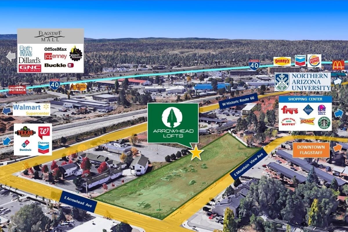 and live because of its high elevation, moderate temperature, and natural beauty. It is surrounded by the 1.8+ million acre Coconino National Forest which is the largest contiguous Ponderosa Pine forest in the world. This development site is approximately two miles away to the popular, historic downtown area filled with dining options, boutiques, microbreweries, coffee shops, art galleries, and more. Many new amazing restaurants have opened up in the last few years as both downtown and the Southside Historic District have seen a great influx of new businesses and continued gentrification. The site is also just over two miles to the NAU campus where there is a severe shortage of housing options. Flagstaff offers a wealth of activities all year round including skiing/snowboarding and other fun winter activities, amazingly moderate temperatures in the summer months, hiking, mountain biking, and more. Given the average of 288 days of sunshine per year along with an extensive list of outdoor activity options, Flagstaff is an extremely attractive city for both of the best college towns in the country short and long-term residential location makes this an incredibly unique and rare offering. The approved plans are for a building comprised of 52 units with 13 studios, 16 one bedrooms, 18 two bedrooms, and 5 three bedroom units (3 of which are amazing penthouses), all with great private outdoor space and a large common outdoor space. The residences will occupy the 3 stories above the parking level in a “mock-podium” deck-style. Podium-deck construction achieves higher density per acre, requires less paving, allows for more parking on smaller sites, reduces storm water detention and retention, and allows a rare opportunity to provide semi-conditioned, indoor-secured parking in a cold weather climate. The building is designed with a structural steel frame with bolted connections spanned with bar-joists and concrete decks. The building is small enough that no fire protection is needed for any of the structure. Only a 1 hour drywall fire separation between units in conjunction with a fire sprinkler system is required. The project has 65 indoor parking spots, 18 outdoor surface spots, plus 4 new spots in the street created for guest parking. Vertical circulation is via 3 stair towers and 1 elevator. The city of Flagstaff is one of the most popular areas in all of Arizona to visit and live because of its high elevation, moderate temperature, and natural beauty. It is surrounded by the 1.8+ million acre Coconino National Forest which is the largest contiguous Ponderosa Pine forest in the world. This development site is approximately 2 miles away from the popular, historic downtown area filled with dining options, boutiques, microbreweries, coffee shops, art galleries, and more. Many new amazing restaurants have opened up in the last few years as both downtown and the Southside Historic District have seen a great influx of new businesses and continued gentrification. The site is also just over 2 miles to the NAU campus where there is a severe shortage of housing options. Flagstaff offers a wealth of activities all year round including skiing / snowboarding and other fun winter activities, as well as amazingly moderate temperatures in the summer months with hiking, mountain biking, and more. Given the average of 288 days of sunshine per year along with an extensive list of outdoor activity options, Flagstaff is an extremely attractive city for both short and long term residents as well as students in one of the best college towns in the country.location makes this an incredibly unique and rare offering. The approved plans are for a building comprised of 52 units with 13 studios, 16 one bedrooms, 18 two bedrooms, and 5 three bedroom units (3 of which are amazing penthouses), all with great private outdoor space and a large common outdoor space. The residences will occupy the 3 stories above the parking level in a “mock-podium” deck-style. Podium-deck construction achieves higher density per acre, requires less paving, allows for more parking on smaller sites, reduces storm water detention and retention, and allows a rare opportunity to provide semi-conditioned, indoor-secured parking in a cold weather climate. The building is designed with a structural steel frame with bolted connections spanned with bar-joists and concrete decks. The building is small enough that no fire protection is needed for any of the structure. Only a 1 hour drywall fire separation between units in conjunction with a fire sprinkler system is required. The project has 65 indoor parking spots, 18 outdoor surface spots, plus 4 new spots in the street created for guest parking. Vertical circulation is via 3 stair towers and 1 elevator. The city of Flagstaff is one of the most popular areas in all of Arizona to visit and live because of its high elevation, moderate temperature, and natural beauty. It is surrounded by the 1.8+ million acre Coconino National Forest which is the largest contiguous Ponderosa Pine forest in the world. This development site is approximately 2 miles away from the popular, historic downtown area filled with dining options, boutiques, microbreweries, coffee shops, art galleries, and more. Many new amazing restaurants have opened up in the last few years as both downtown and the Southside Historic District have seen a great influx of new businesses and continued gentrification. The site is also just over 2 miles to the NAU campus where there is a severe shortage of housing options. Flagstaff offers a wealth of activities all year round including skiing / snowboarding and other fun winter activities, as well as amazingly moderate temperatures in the summer months with hiking, mountain biking, and more. Given the average of 288 days of sunshine per year along with an extensive list of outdoor activity options, Flagstaff is an extremely attractive city for both short and long term residents as well as student