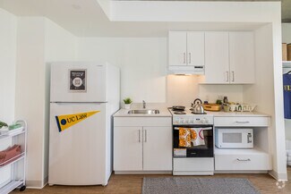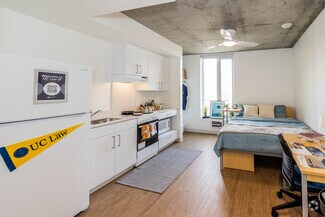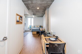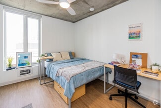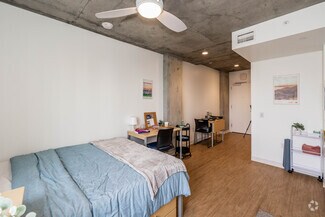• Residential amenities including 24-hour security, shared study rooms, an indoor-outdoor residential lounge, video room, laundry, fitness center, exterior atrium, exterior dog run, and bike storage