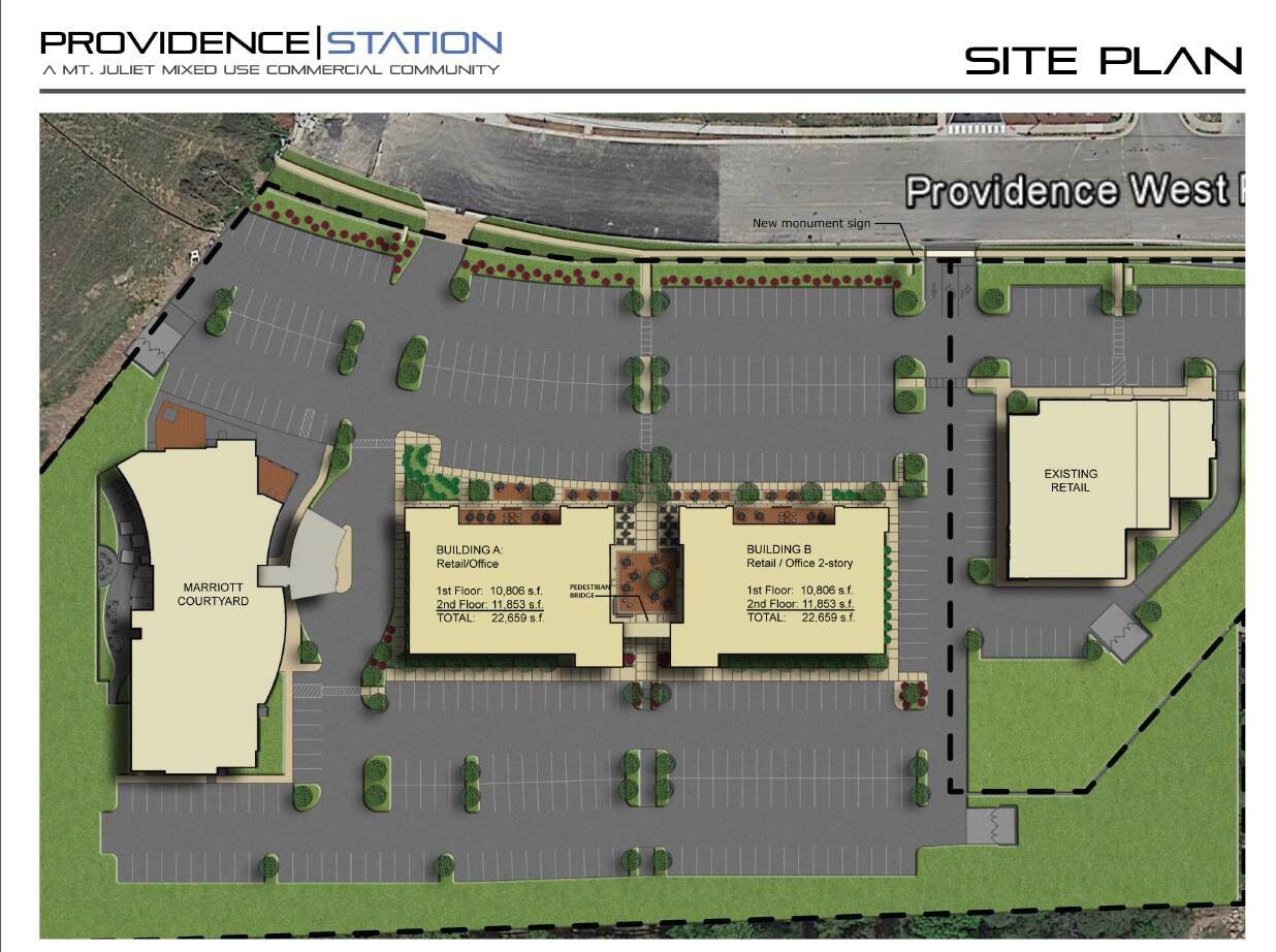 Providence Station is a mixed use community designed to create amenity rich commercial spaces and collaborative environments that bring together a complementary mix of retailers, restaurants, offices, and other businesses. Located in Providence district of Mt. Juliet which includes over 1 Million SF of retail space Next to new Marriott Courtyard Hotel and less than 1/2 mile to Interstate 40 Located on Providence Pkwy. Property features Large courtyard areas for outside dining. Retail is fully leased and we are down to a handful of options for office on the second floor.