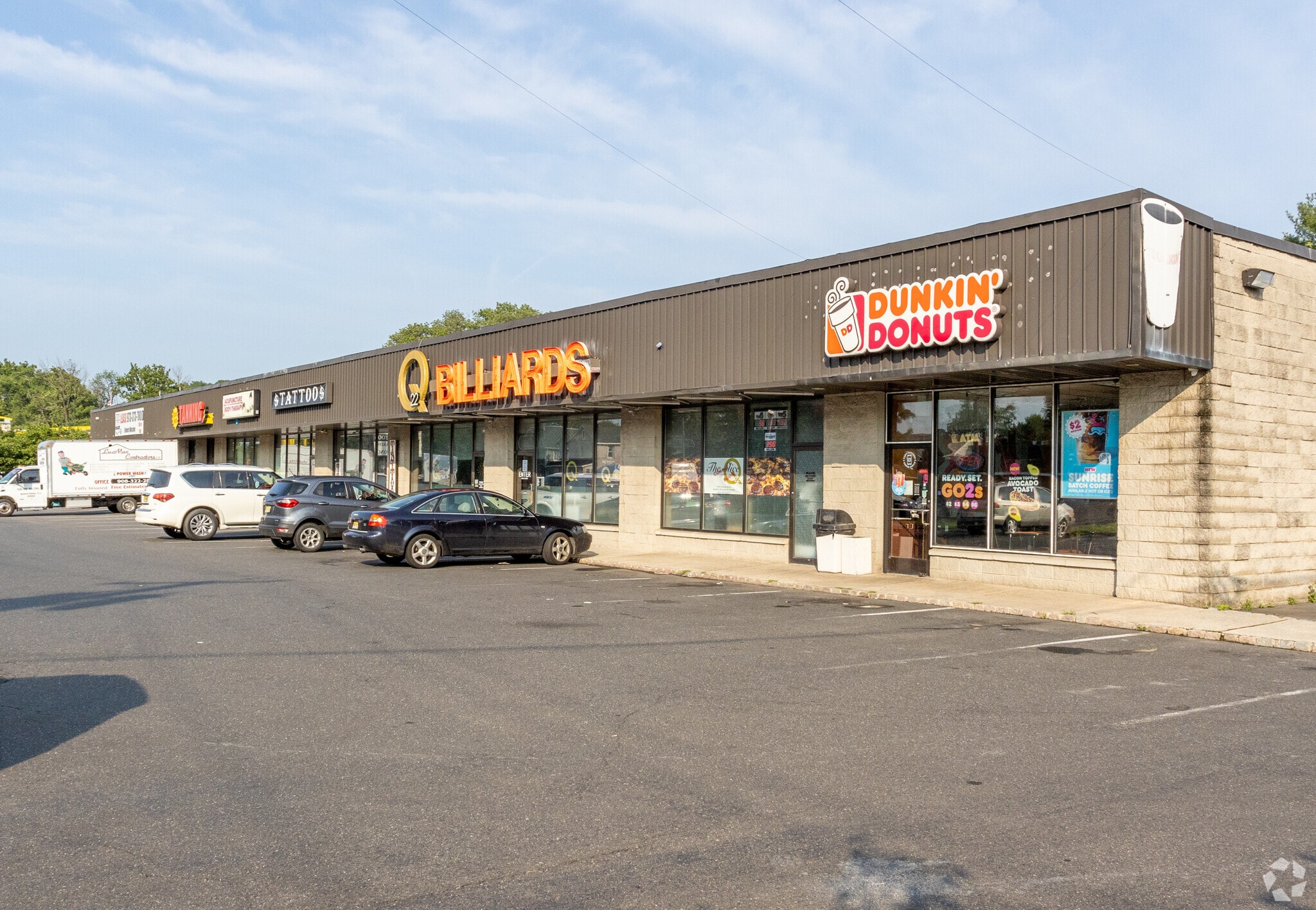 in line retail center with brightly lit parking lot