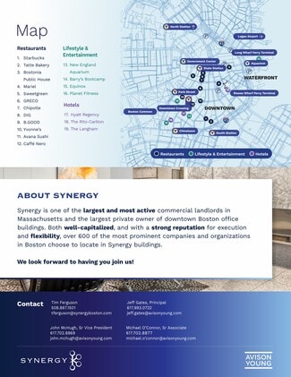 Terrific downtown location one block from Post Office Square. Convenient access to both North and South Station, as well as all MBTA train lines. On-site amenities include two restaurants, sundry shop, shoe shine, bike storage and showers.