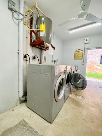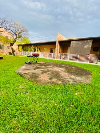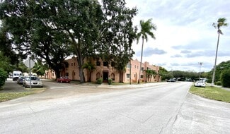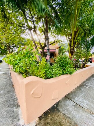 Presenting a rare investment opportunity in Miami Springs—Azure, a historic two-story V-shaped building featuring 23 apartments arranged around a central, garden-style courtyard enclosed by a low, irregular stucco wall. Each wing of the V extends into a smaller one-story section, with an additional one-story building at the rear housing five studio apartments (not part of the original structure).
