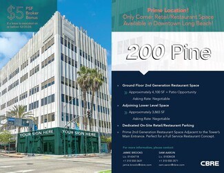 200 PINE at 200 Pine Avenue has a second-generation restaurant space available in the heart of Downtown Long Beach. Located on the hard corner of Pine Avenue and Broadway, this availability is ready to be filled with a restaurant, retail, fitness, or medical concept. 200 PINE includes on-site parking for employees and customers, a huge benefit for businesses that lease the ground floor and basement spaces.
