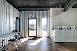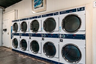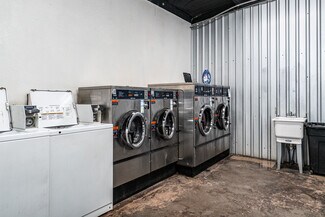 Half of this building is a laundromat and the other half is a BBQ restaurant.