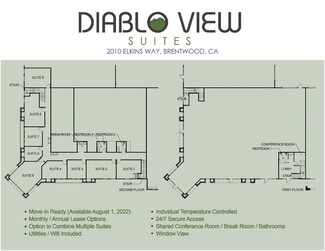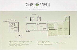 A 2 acre site with thriving business activity in the building. the building was completed in 2021 with fresh, up to date finishes. Very attractive. Great window views. Quiet work environment. Rent Now! Call (925) 550-9238. Rent Office Space in Diablo View Suites that is perfectly designed for the trades seeking a professional work pace with many added features; 24/7 secure access, Free Wifi, shared conference room, break room, monthly all inclusive rent rates. Rent Now! Call (925) 550-9238.