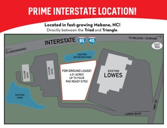 RCR is pleased to offer up to ±4.01 acres of commercial land for ground lease in the thriving market of Mebane, North Carolina. Comprising one to four development-ready sites with utilities, zoning, curbing, and stormwater easement infrastructure in place, the property provides an excellent platform for restaurant, QSR, and retail users seeking presence along I-85/I-40. Situated at 204 Lowes Boulevard and adjacent to Lowe’s Home Improvement and two newly constructed hotels, the site enjoys strong traffic patterns and steady demand. Its position at Exit 153 provides outstanding access to both the Triad and Triangle metro areas. Nearby national retailers including; Cracker Barrel, Ruby Tuesday, KFC, Smithfield’s BBQ, Hampton Inn, Holiday Inn Express, and Southern States, underscore the strength of the trade area. With notable traffic counts, expanding rooftops, and robust commercial momentum, this offering provides a rare opportunity to secure a high-visibility site in one of Mebane’s premier commercial corridors.