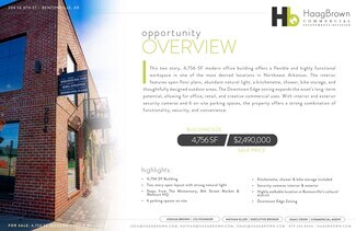 This two story, 4,756 SF modern office building offers a flexible and highly functional workspace in one of the most desired locations in Northwest Arkansas. The interior features open floor plans, abundant natural light, a kitchenette, shower, bike storage, and thoughtfully designed outdoor areas. The Downtown Edge zoning expands the asset’s long-term potential, allowing for office, retail, and creative commercial uses. With interior and exterior security cameras and 6 on-site parking spaces, the property offers a strong combination of functionality, security, and convenience.