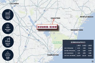 Optimal Lease Structure - Attractive 20-year base term - Four (4), 5-year renewal terms - 10% rent escalations every 5 years throughout entire lease - Absolute NNN lease with NO LL responsibilities - Strong personal and franchisee guarantee Best-In-Class QSR Tenant - Newly constructed Burger King - 2020 construction with latest BTS prototype o Double drive-through to support volume and enhance efficiencies o 2,300 SF prototype of newest layout available from BK corporate o Indoor seating with 70 seats o Online ordering available with plans to offer delivery - Burger King rankings: o #6 biggest fast-food chain in America (2019 QSR Magazine) o #2 biggest burger chain in America (2019 Work+Money) - Brand has 17,800+ locations worldwide Strong Real Estate Fundamentals - Flat topography with optimal visibility - Ample parking with 30 spaces - Located at the intersection of Longstreet Street & Mill Street o Frontage and full access on both streets - Kingstree is the county seat of Williamsburg County - Diversified economic base in Williamsburg County anchored by manufacturing, public administration, and health care About the Operator - Carolina Franchise Holdings - Preferred territories span GA, SC & NC - Management Team includes professional backgrounds covering development, accounting & QSR operations - Cumulative experience of Management Team exceeds 160+ years of professional experience - 1 of 5 franchisees across North America selected by Burger King Corporate to beta test new operations model rolled out to all franchisees in 2020