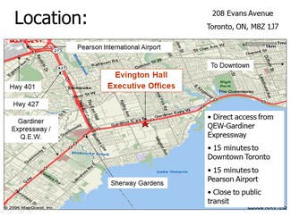 Evington Hall is a well established multi-tenant executive suites building that leases office suites to those who need a place to work in a convenient location, in a relaxed atmosphere. Located in the west end of Toronto, Evington Hall is well placed – near the intersection of Evans Avenue, and Islington Avenue.  Evington Hall allows for easy access to the QEW, and is close to the Mimico GO station and  Kipling GO station, well serviced TTC routes that connects to the Kipling subway station, Royal York subway station and Islington subway station.  Whether you need to drive to work, or commute to work, Evington Hall is accessible. 2-level walk-up office building with a large central atrium and 28 individual HVAC office units, facing into central atrium. Easy access from QEW at Islington Avenue in West Toronto (Etobicoke) near Sherway Gardens Shopping Centre surrounded by many great restaurants. Short trip from the GO train MIMICO stop on Royal York near San Remo Bakery, with TTC passing right by the front door for bus route connectivity. Free parking for tenant & guests. Spa-like design with lots of natural wood in a quiet, relaxing environment. Some offices include fireplaces. Various pieces of furniture available for use if desired (tables, chairs, filing cabinets, etc.). Includes individual office with 24 hour FOB access, plus use of the shared common areas - all of which are cleaned multiple times per week included with the rental price. Use of a shared printer (cost per page), shredder, kitchenette with toaster, kettle, fridge, microwave, utensils, coffee machine, etc.), 5 washrooms including Universal washroom with shower. Free Bike Rack. TTC close by with bus stops on Evans Avenue. Short drive to downtown Toronto and Pearson Airport or Hamilton via QEW. Use of boardroom available with enhanced audio video technology. IT person available on-site. Personal office doors with keypad entry available. 24 hour security cameras on parking and common areas. Brand new drive-thru Starbucks now open just 260 m front the front door. Annual Holiday Celebration in December included for all tenants. Ownership & property management both located on site for your convenience. Tours of the building can be arranged to discuss potential lease terms. Co-operating brokers protected for introducing a tenant who signs a lease of 1 year or more.