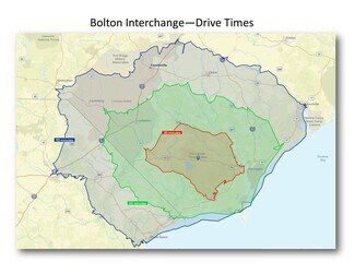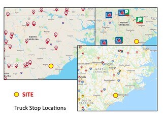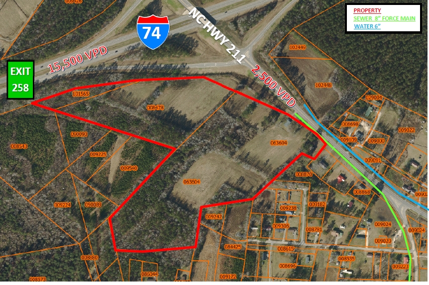 34.5 Acres +/-. Great midway stop from I-95 and Wilmington, NC along the I-74 corridor (14,000 VPD). Southwest corner of interchange, with 1386 front feet on I-74 and 1086 front feet on NC 211. Only 13 miles from the new International Logistics Park on I-74 toward Wilmington. New diesel repair shop under construction directly across Hwy 211 from site. also. Inexpensive land with all municipal utilities near site. Owner will either rezone or allow buyer time to rezone.