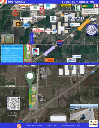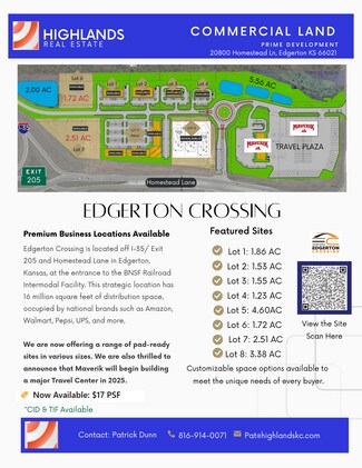 Edgerton Crossing is located off I-35/ Exit 205 and Homestead Lane in Edgerton, Kansas, at the entrance to the BNSF Railroad Intermodal Facility. This strategic location has 16 million square feet of distribution space, occupied by national brands such as Amazon, Walmart, Pepsi, and more.We are now offering a range of pad-ready sites in various sizes. We are also thrilled to announce that Maverik will begin building a major Travel Center in 2025. Site Available/ Ideal Tenants: 2 Hotels and Conference Center Quick Service Restaurant Pad Sites Casual Dining Restaurant with Bar Office Pad Sites Retail Pad Sites