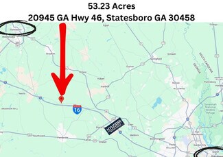 Beautiful 53.23 acres of near-level land well located just off Interstate 16 at the Ash Branch Church Road exit. The property sits on the north side of Interstate 16 at the intersection of Highway 46 and Arcola Road and has open farm land as well as some timber. This section of I-16 sees approximately 37,000 vehicles per day. Located just ten miles from the new automobile plant this parcel could be used for a variety of different things. It is currently zoned agricultural (AG-5 per Bulloch County). On the lower western corner of the parcel is approximately 4 acres with a house that is not included with this parcel. This parcel is conveniently located approximately halfway between Statesboro and Savannah. The owner is a licensed real estate broker in the state of Georgia. 48.42 acres located directly across the street are also available for sale.