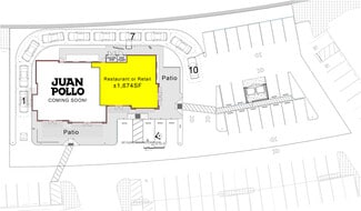 • Join Juan Pollo drive-thru restaurant opening soon! • ±1,674sf available for restaurant or retail use • Large exclusive patio • Existing grease trap • Brand new building • Contemporary architecture with brick accents and steel awnings • Substantial 4-sided tower signage in addition to monument signage at the Lakeview Ave entrance