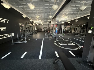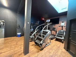 The interior offers soaring ceilings, modern industrial finishes, and an abundance of natural light through large storefront windows. The open floor plan allows for flexible configurations, while existing infrastructure supports gym, studio, or training uses with ease. Stylish design elements and high-end finishes create a contemporary, upscale atmosphere that can be easily reimagined for a new tenant.