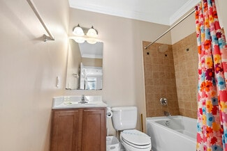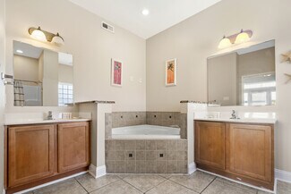 offers 2 bedrooms, 1.5 bathrooms, a master suite with a master bathroom, a ceramic tiled walk-in shower, a whirlpool tub, and a