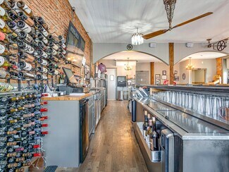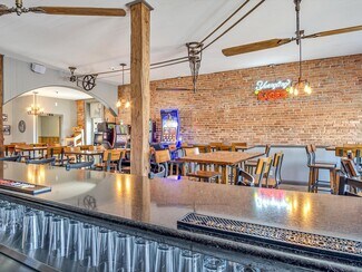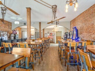 The historic turn-of-the-century building has been thoughtfully renovated while maintaining its character, featuring exposed brick walls, distinctive pulley and belt ceiling fans, and a welcoming bar and dining area. An outdoor patio provides additional seating and enhances the overall guest experience. Parking is available both in front of and behind the building.