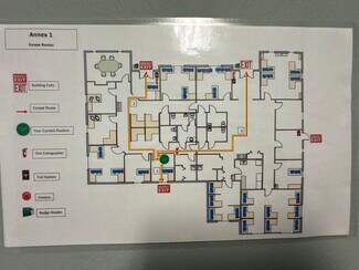 Recent upgrades include a new roof installed in 2025, five well-maintained Trane HVAC systems, and water heaters less than five years old. The building is part of a diversified office park and includes large perimeter offices, conference rooms, and a community kitchen.