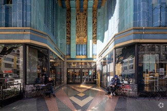 Amenities include central heating and air conditioning, modern exposed ducts, three egress points to the unit, wide entrance steps with four doors, an iconic staircase, and ADA-compliant elevator access. Situated near 9th Street with prominent frontage, the unit is part of a well-known, historically significant corner property featuring 16-foot-high ceilings, sleek concrete slab flooring, and contemporary lighting. The building, dating back to the 1920s, showcases a stunning Zig Zag-style Art Deco design and is zoned for retail and industrial commercial use, with solid block construction.